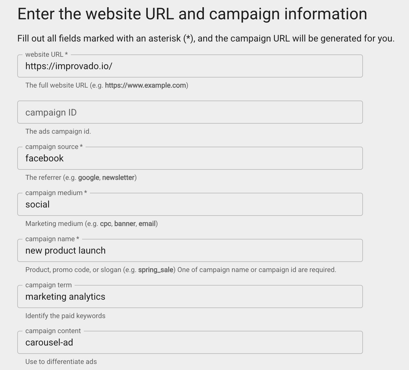 Example output: https://improvado.io/?utm_source=facebook&utm_medium=social&utm_campaign=new+product+launch&utm_term=marketing+analytics&utm_content=carousel-ad