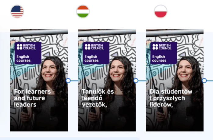 The British Council needed to scale its “Global English” campaign across multiple countries and languages without ballooning costs or production timelines. By using AI-driven design tools, it automated the creation and localization of over 1,000 ad variations in seven languages, all while maintaining brand consistency and regional relevance.