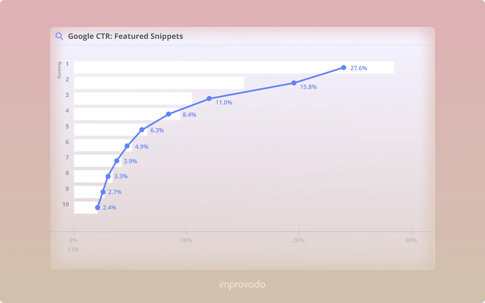 This metric shows how many people click on your content. By tracking clicks, you can understand how engaging the content’s title is. If your piece has a high SERP position but doesn’t generate enough traffic, you need to come up with a more catchy title. You can use the chart below as a CTR benchmark for your content pieces. The higher your article is on SERP, the higher the projected CTR is.