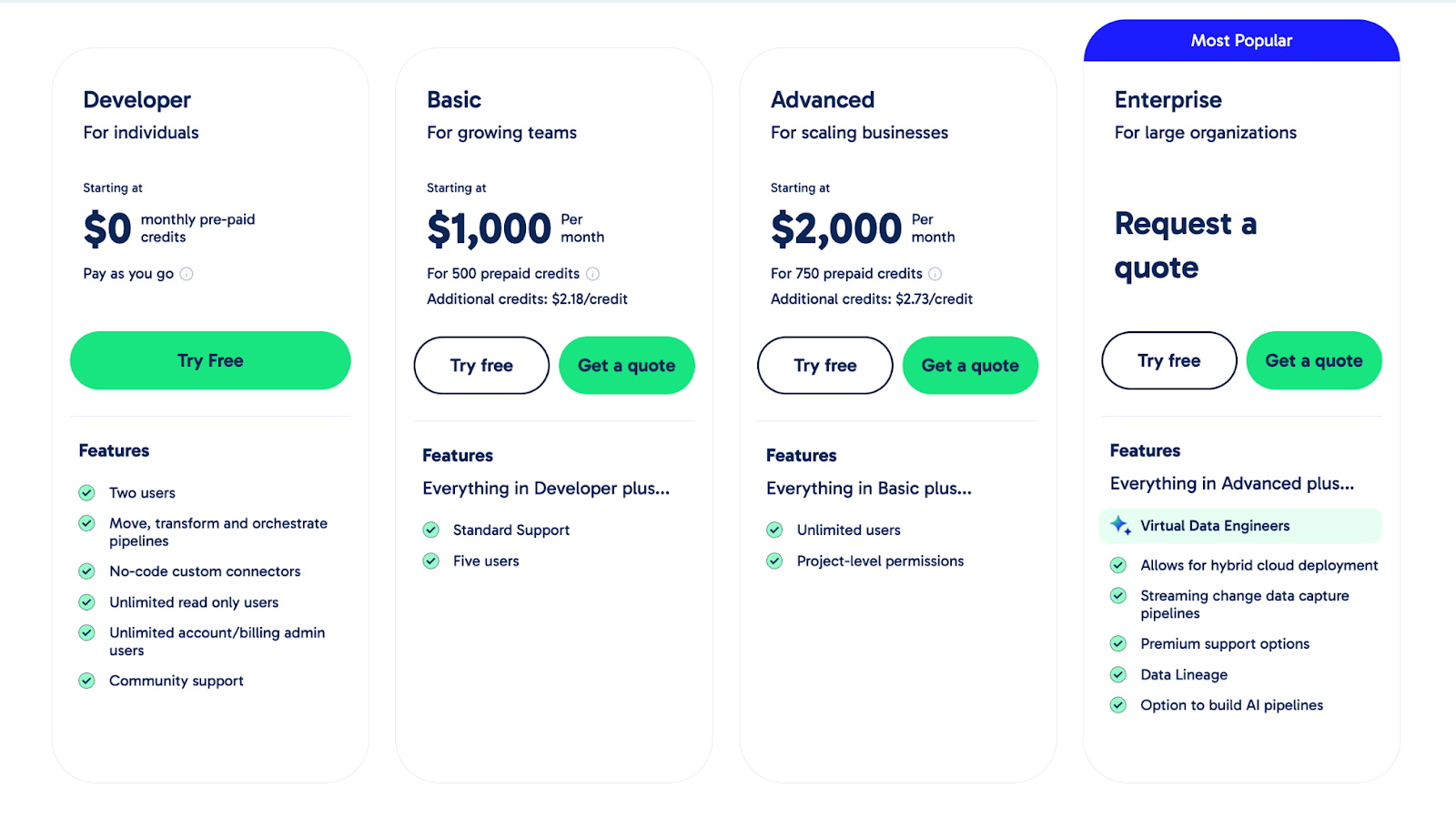 The platform offers several pricing tiers that provide MAR allowances and different features, for example, frequency of data sync, integration for dbt, and others.