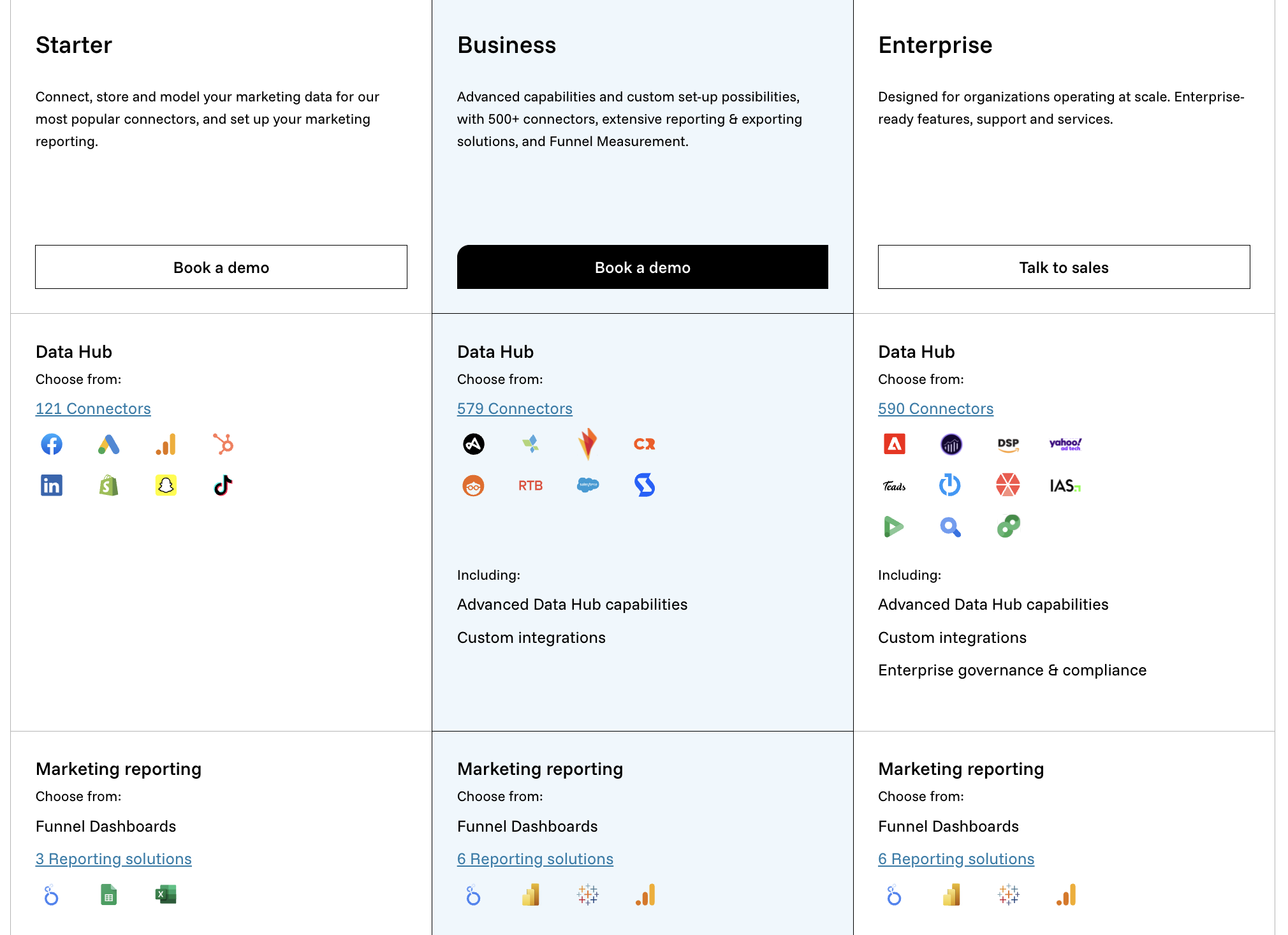 Funnel.io offers four main pricing plans tailored to different organizational needs: Starter, Business, and Enterprise.