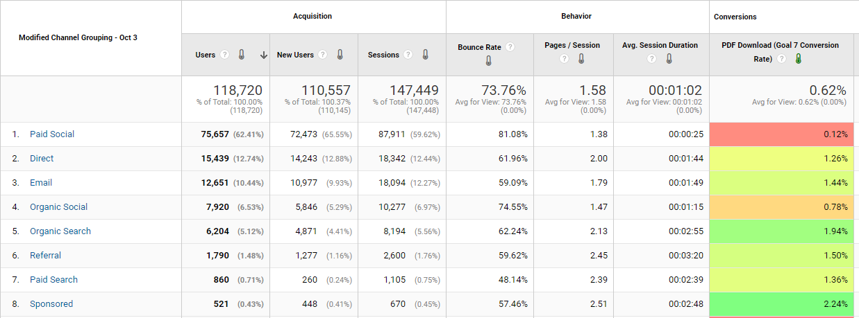 The screenshot above shows how easy analysis becomes when you have goals setup. You can very clearly identify which traffic source has a higher propensity to download a PDF. Setting up goals is one of the most important things you should do in Google Analytics. Make sure to set up goals for both micro and macro actions on your website. Creating a measurement plan is a good idea to document everything you are hoping to achieve.