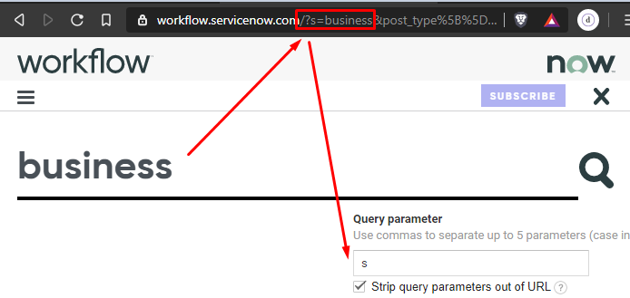 - Note what query parameter is capturing your search. In the example below, I searched for business articles. The parameter with my keyword is “s”