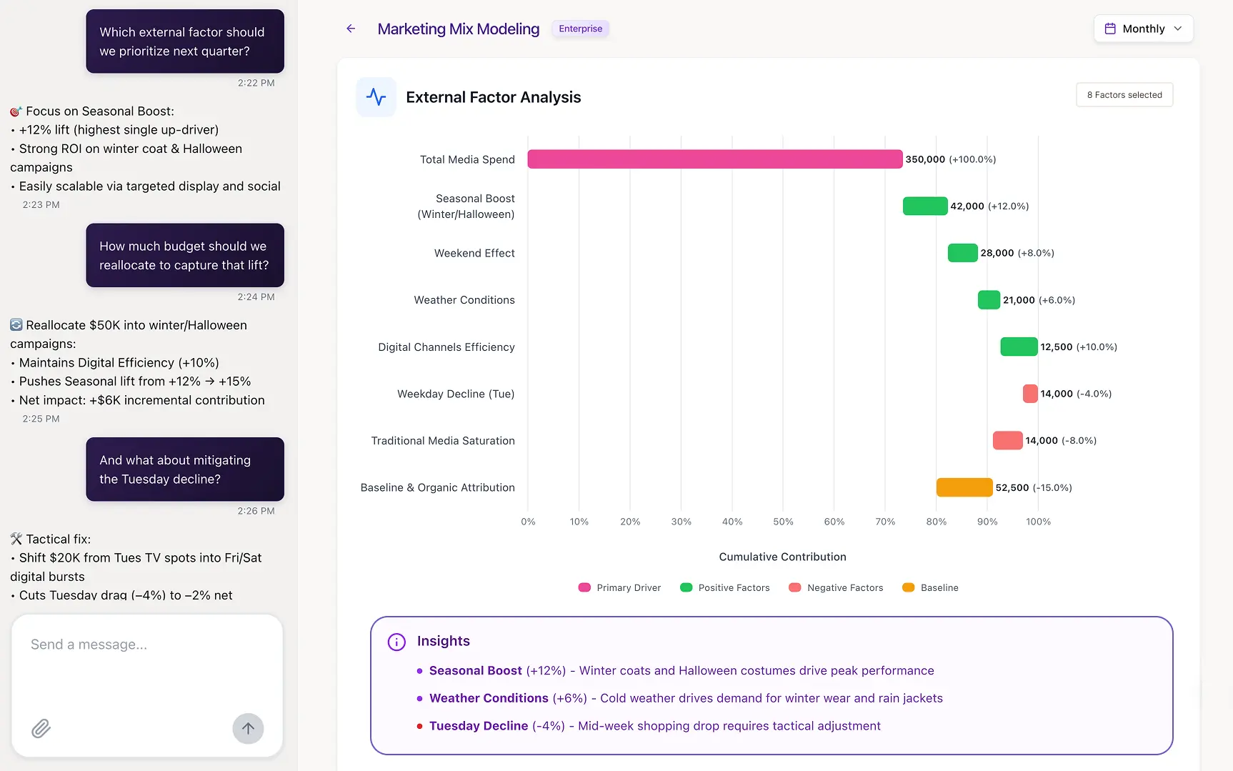 It can measure the impact of both online and offline channels (like TV, radio, and print) and account for external factors like seasonality, economic conditions, and competitor actions.