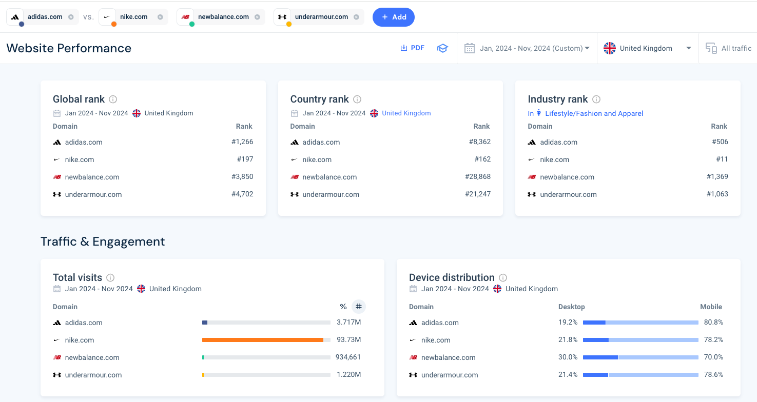 • Provides detailed traffic, engagement, and channel breakdowns for competitor websites and apps.
