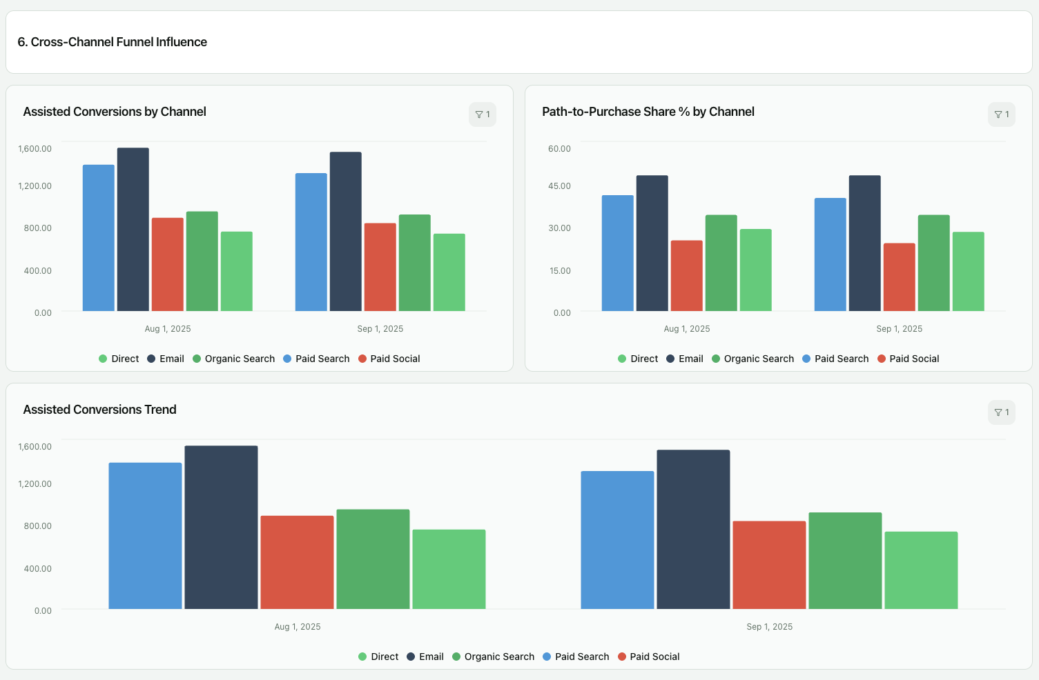 Growth decisions require understanding how channels interact, not how they perform in isolation. A unified dashboard shows how paid social drives first-time visits, how search captures intent, how email converts returning customers, and how these paths translate into revenue and lifetime value.