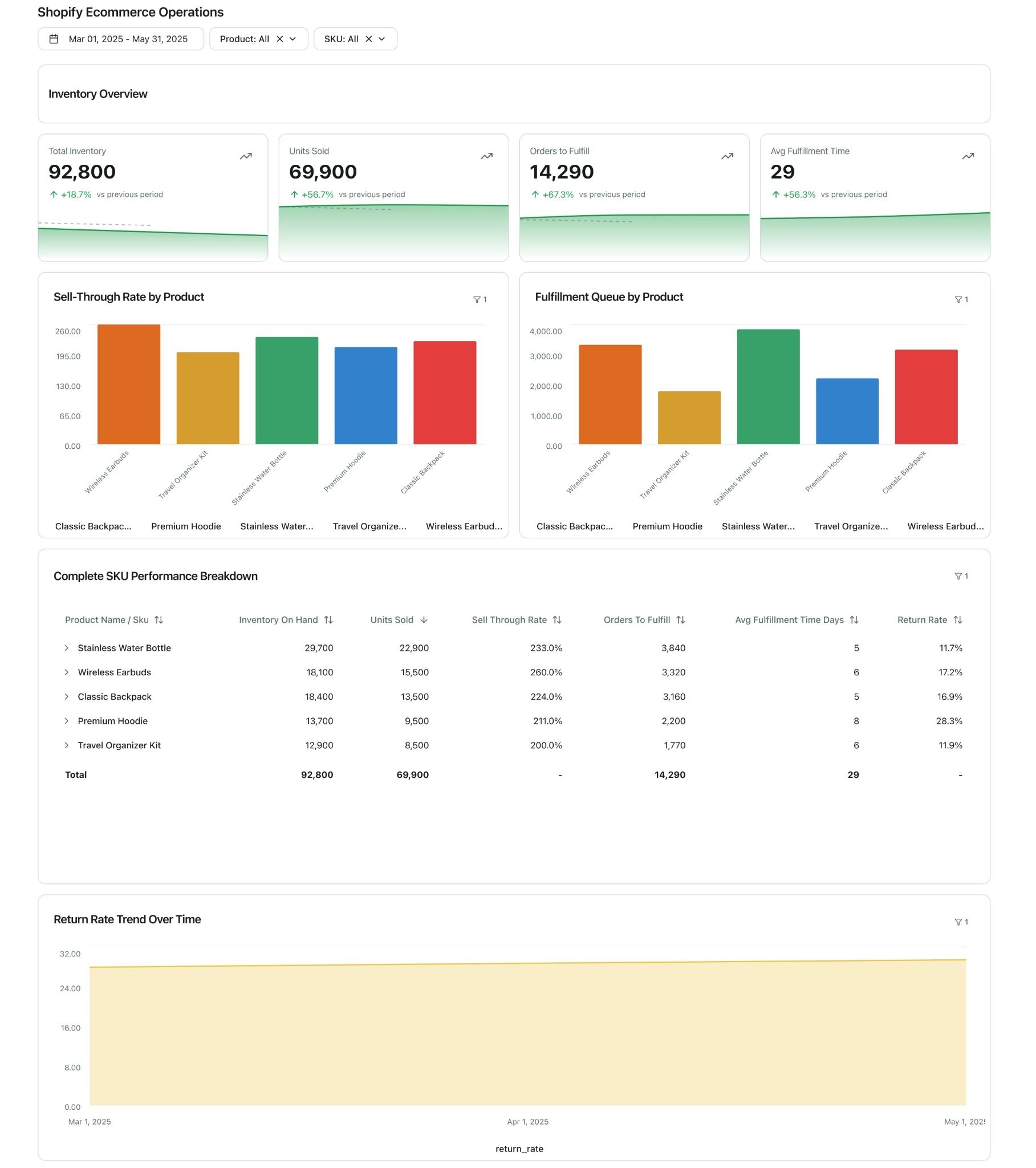 - Key Metrics: Inventory Levels by SKU, Sell-Through Rate, Orders to Fulfill, Average Fulfillment Time, Return Rate by Product.