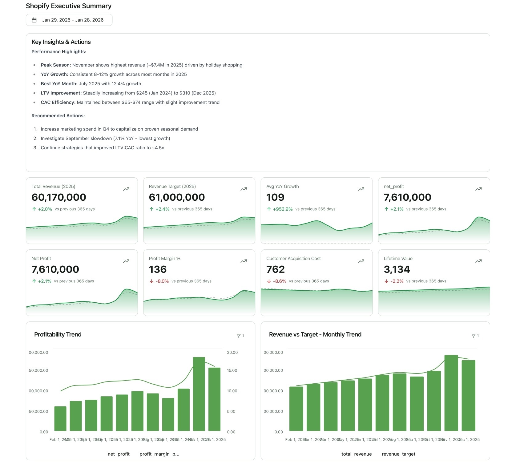 - Key Metrics: New vs. Returning Customer Revenue, Repeat Purchase Rate, LTV by Cohort, Churn Rate, Time Between Purchases.