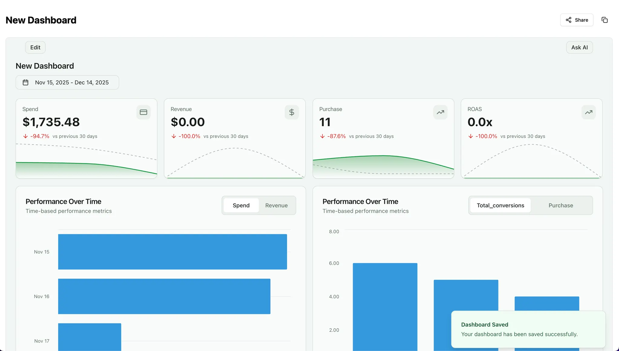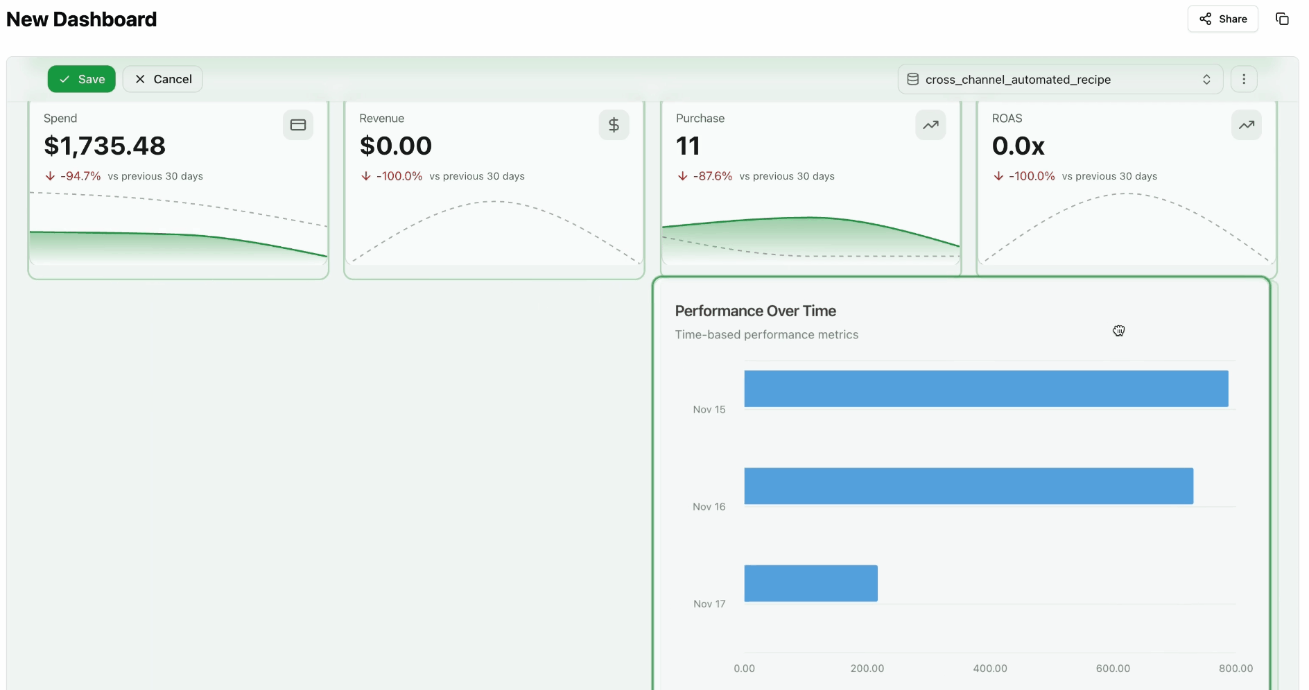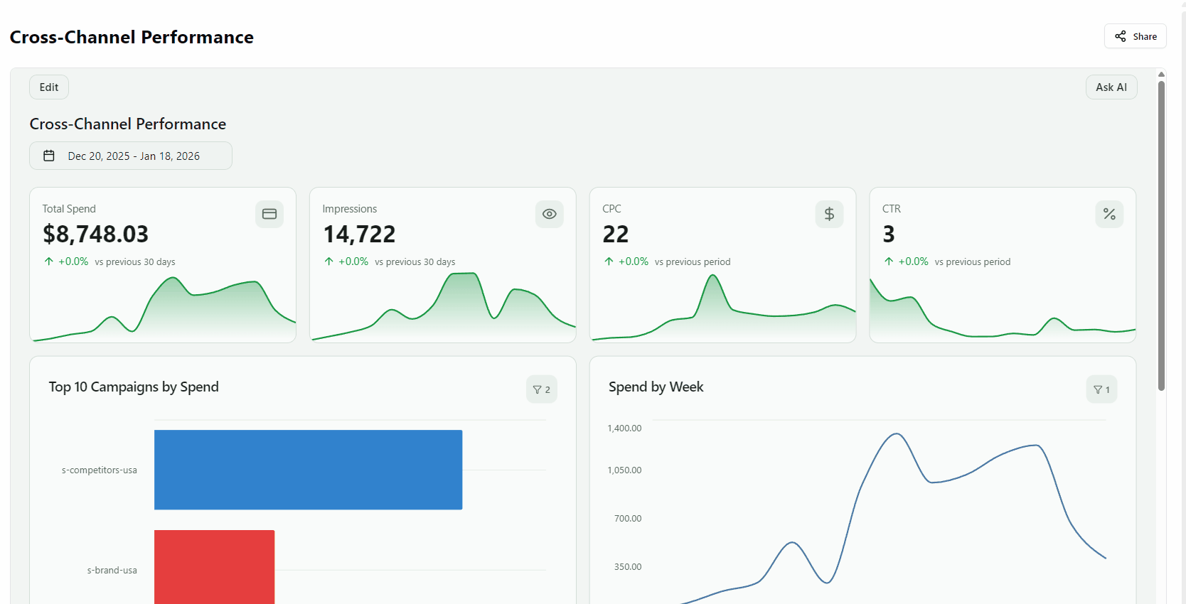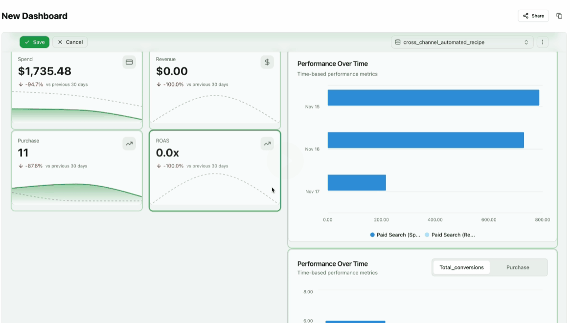 Multi-page dashboards are ideal for executive vs. detailed views, multi-channel reports, campaign drill-downs, and regional breakdowns. See Multi-Page Dashboards for the full guide.