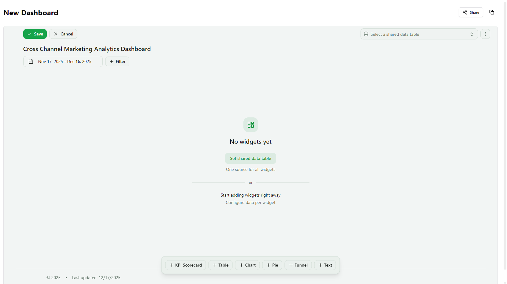 Once a dashboard is created, you enter Edit Mode, where you can configure data, widgets, and layout.