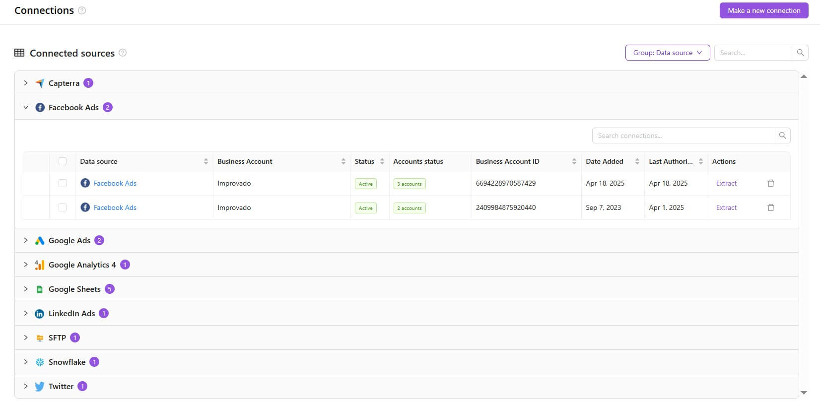 The Group option allow you to organize connections by data source, making it easier to manage and navigate large sets of items.