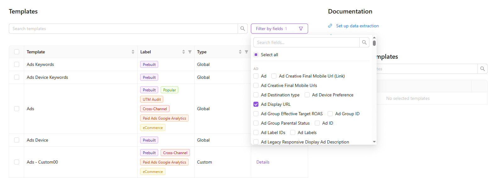 Suppose you know the fields you want to see in extracted data. In that case, you can find the relevant global and custom extraction templates by properties/dimensions Field Name from Improvado Data Dictionary without leaving the extraction flow using the Extraction Template filter.