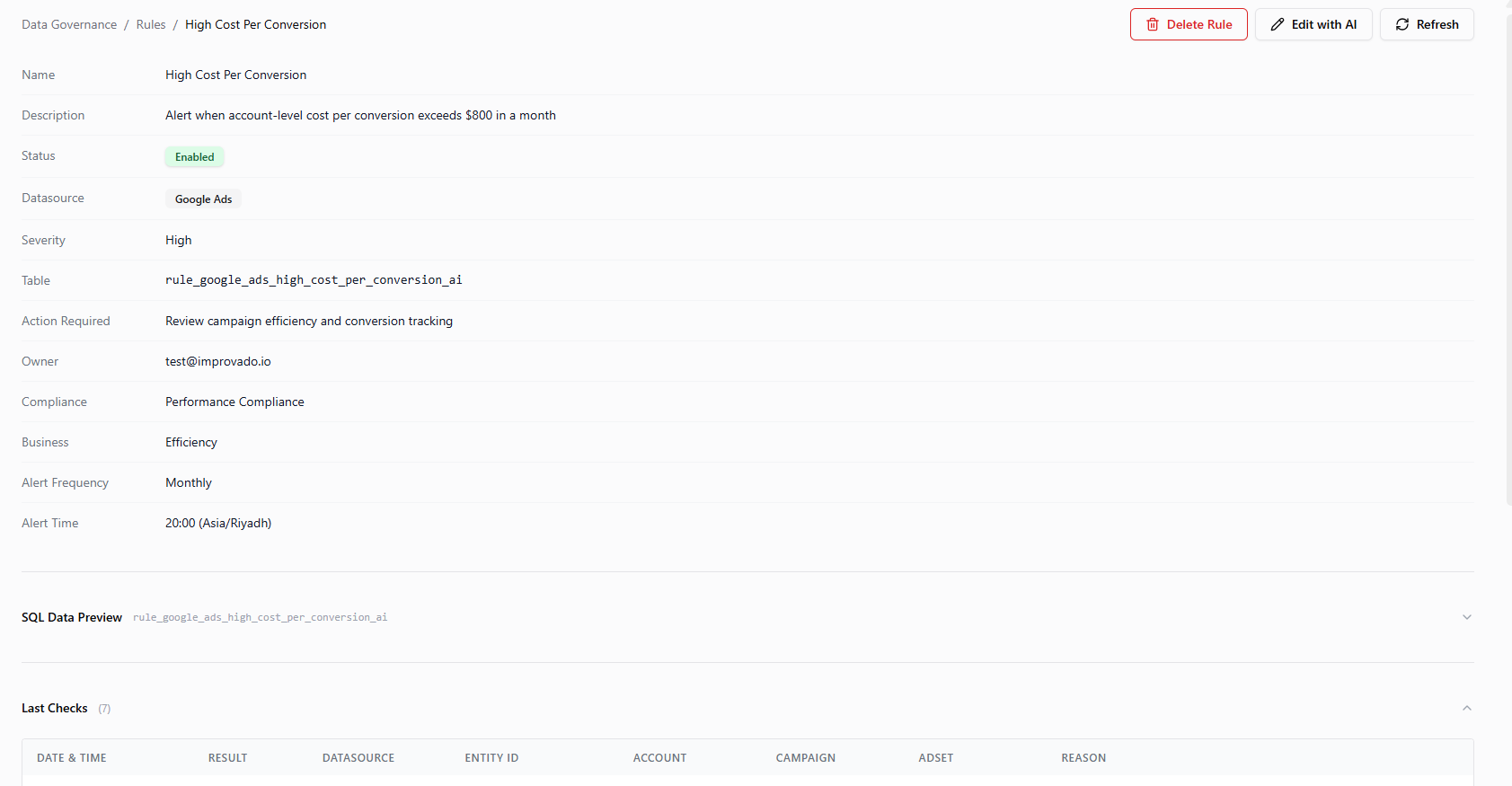 Improvado's Data Governance Email Alerts keep rule owners informed about the health of their data automatically, on a schedule they define. Instead of manually checking the Data Governance Dashboard, rule owners receive a digest email summarizing how all their rules are performing.