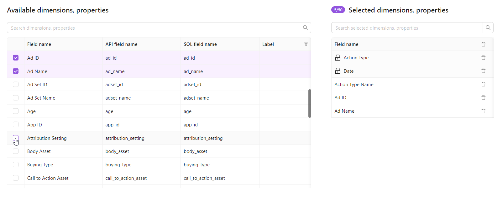 Step 4. Select action breakdowns for your report. Each selected breakdown multiplies the number of rows in your dataset.