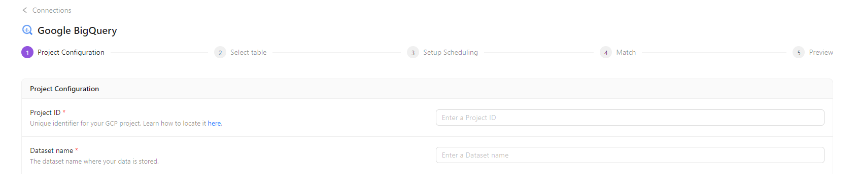 In the Project ID field, enter the unique identifier for your Google BigQuery project. Learn how to locate it here.
