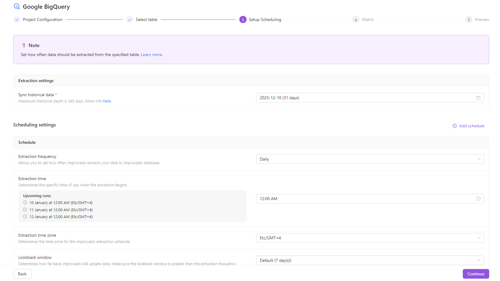 Configure your Extraction scheduling. Allows you to set how often your data is extracted to Improvado storage.