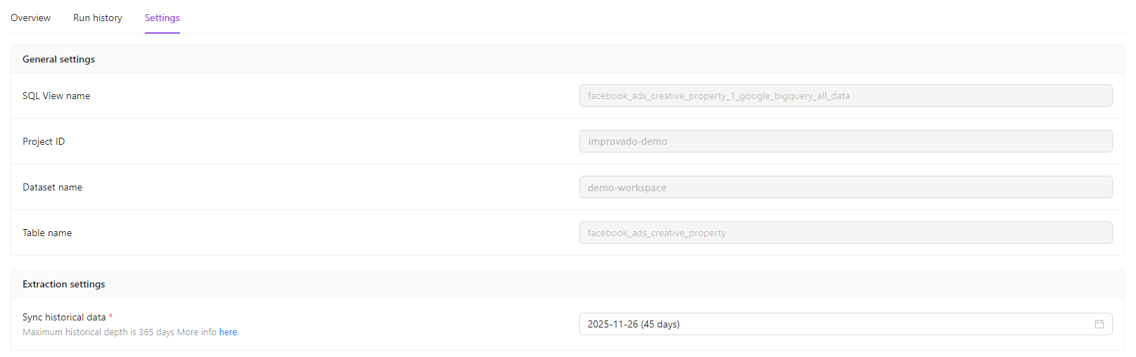 Here you can see your SQL View name, Project ID, Dataset name, and edit your Sync historical data period and scheduling settings for your data extraction.