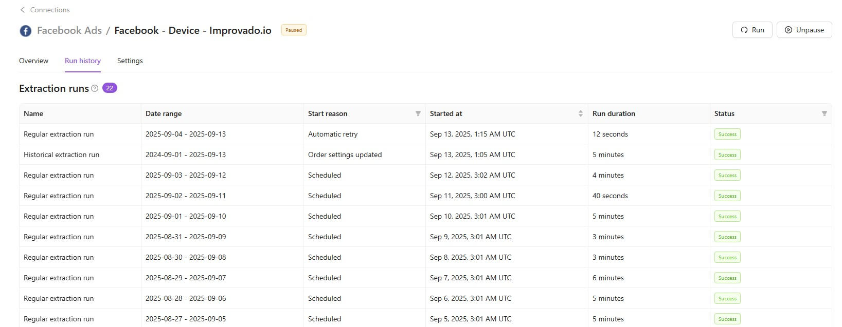 On the top right corner of this page, you’ll see Run Extraction button and a button for starting/pausing data extraction for an Extraction Order depending on its status.