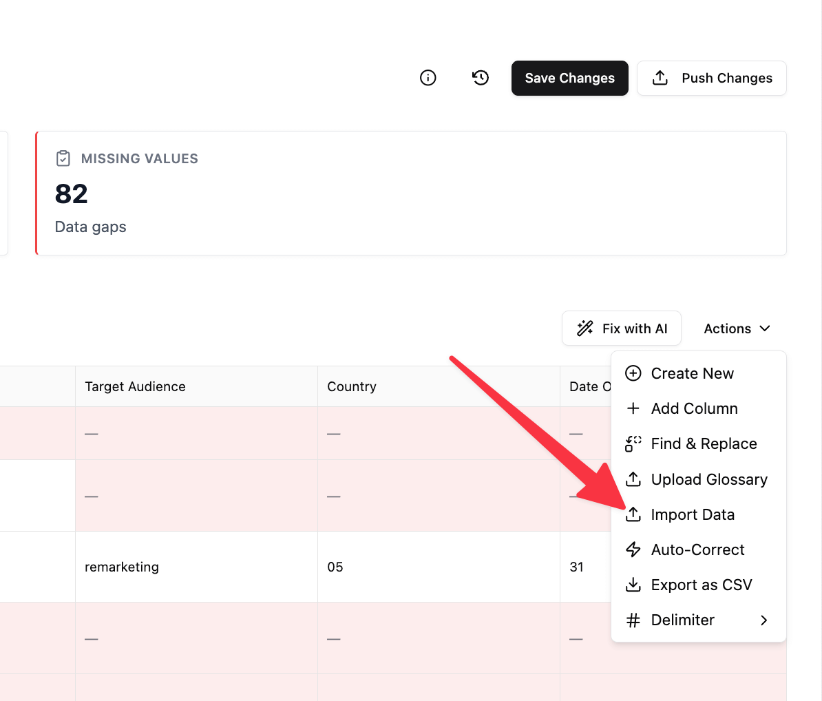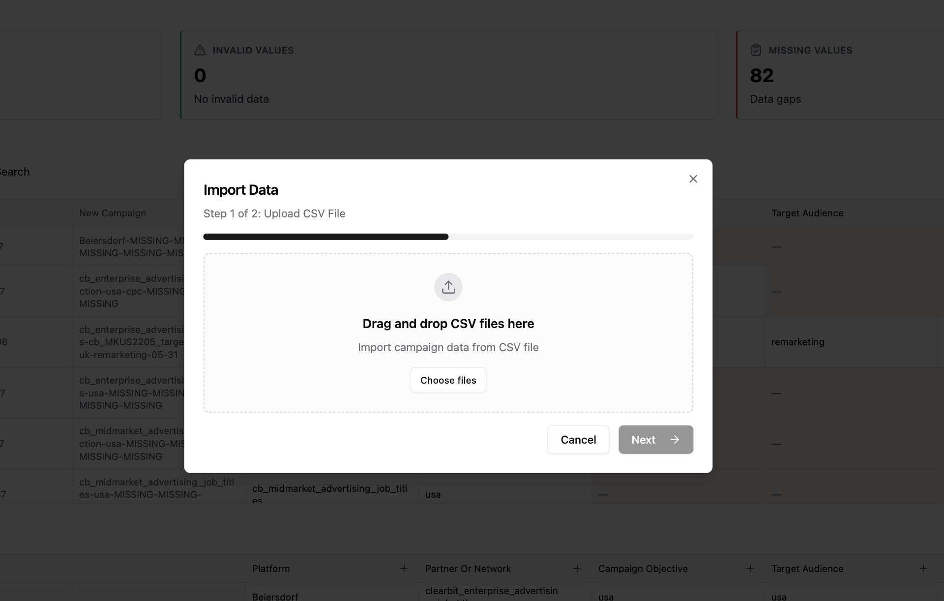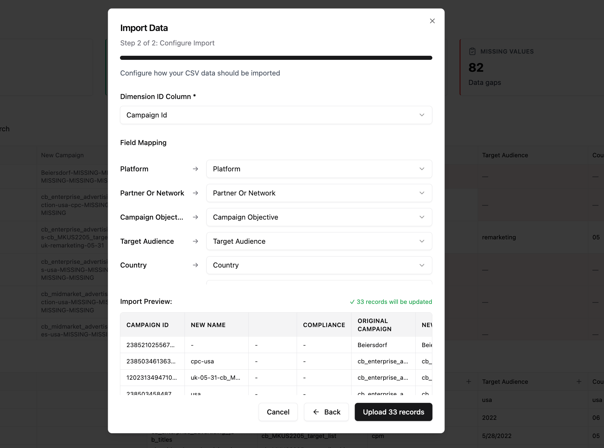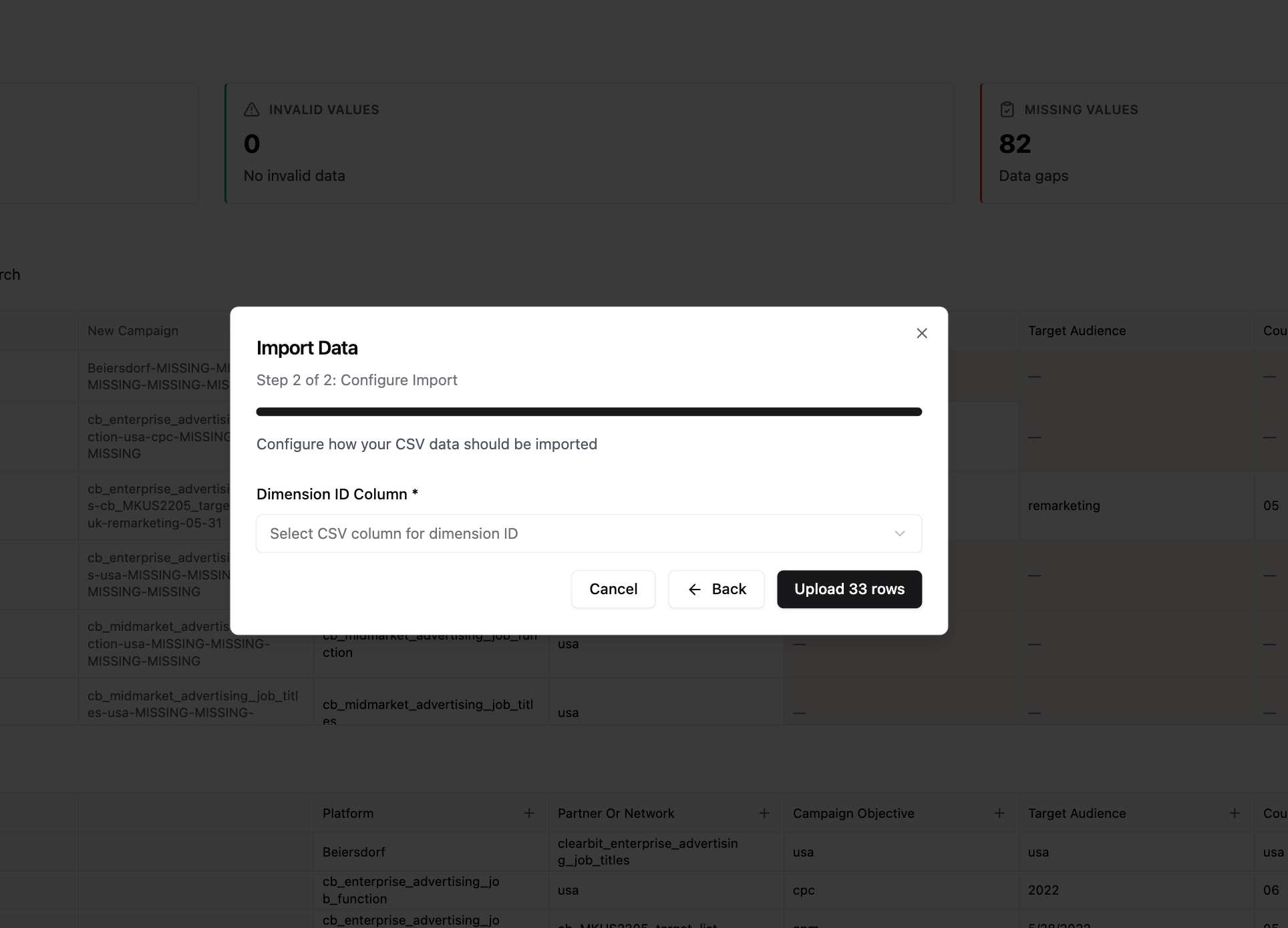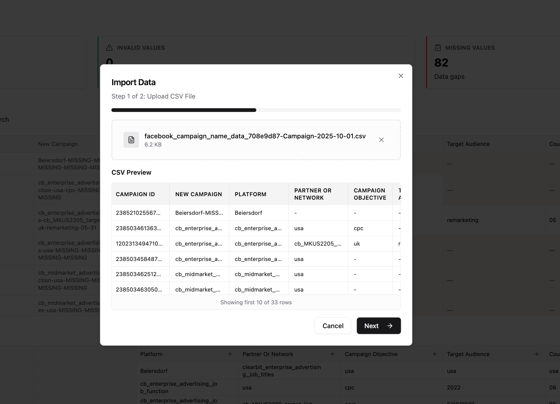 If you manage large volumes of naming data (IDs, assets, creatives, or other taxonomy elements), manual editing can be slow. With the Import Data feature, you can bulk update everything by uploading a CSV file.