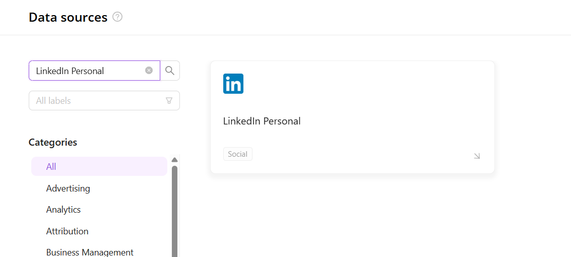Categories on the Data sources page group all available platforms. Use a search to find the required one.