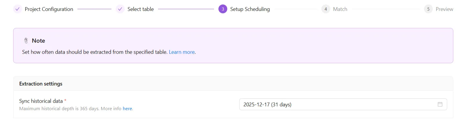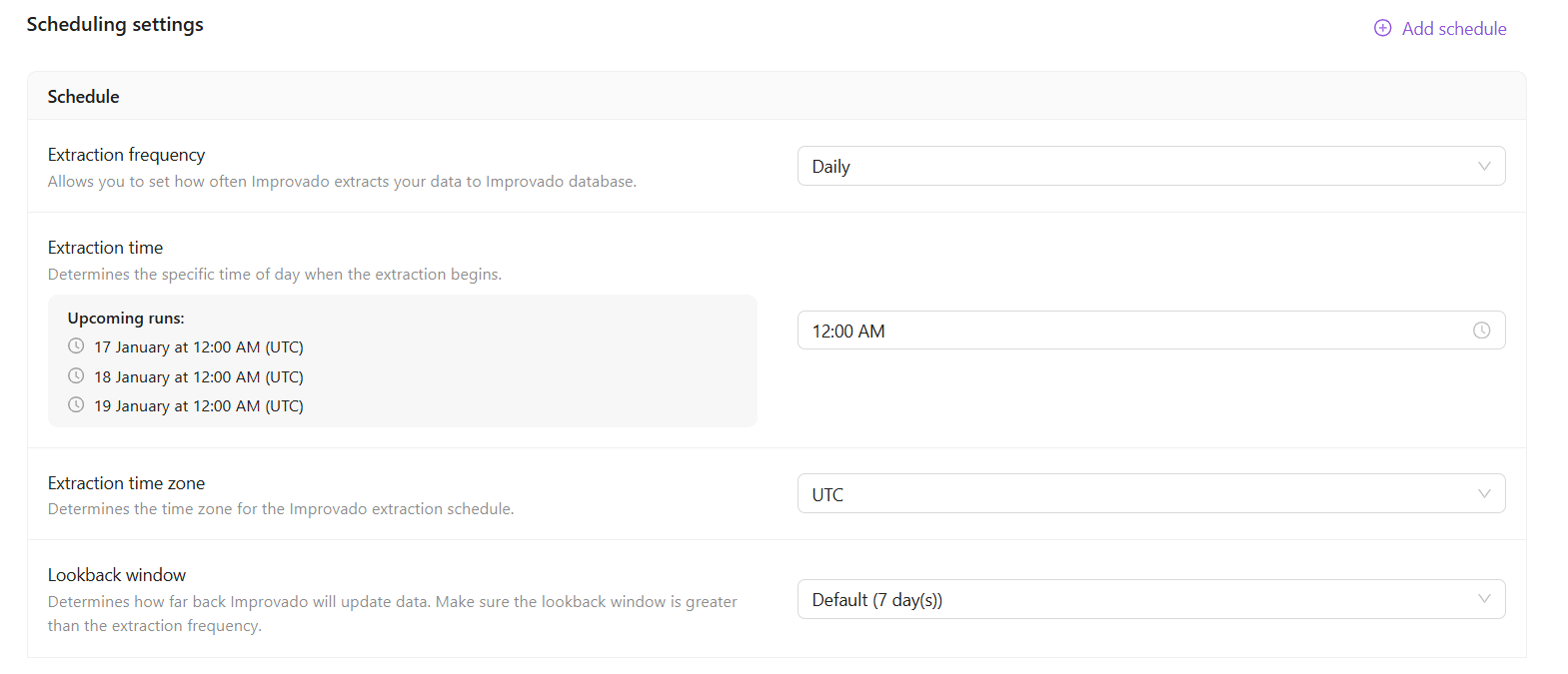 Configure your Extraction scheduling. Allows you to set how often your data is extracted to Improvado storage.