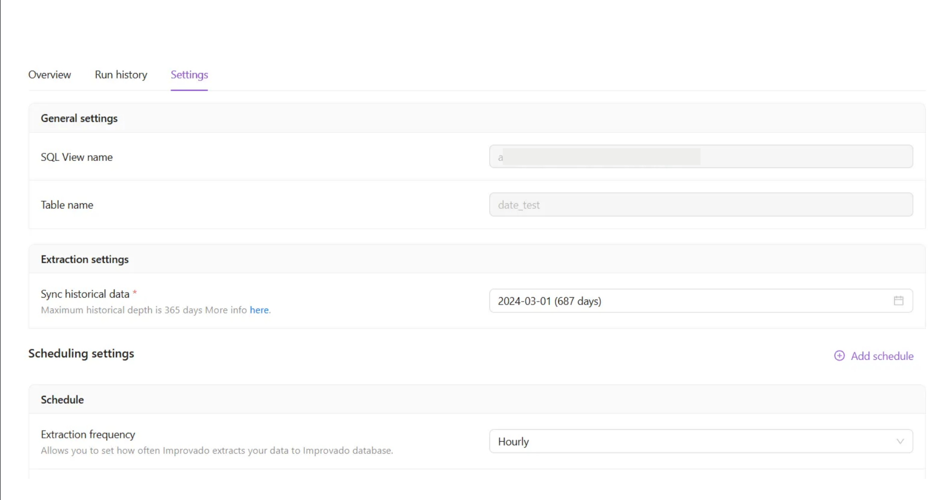 Here you can copy your SQL View name and edit your Sync historical data period and scheduling settings for your data extraction.