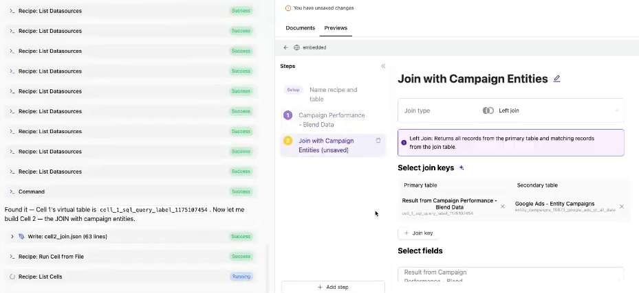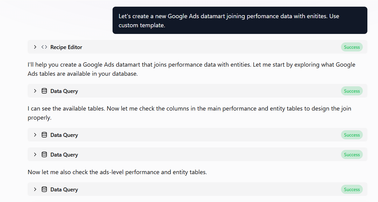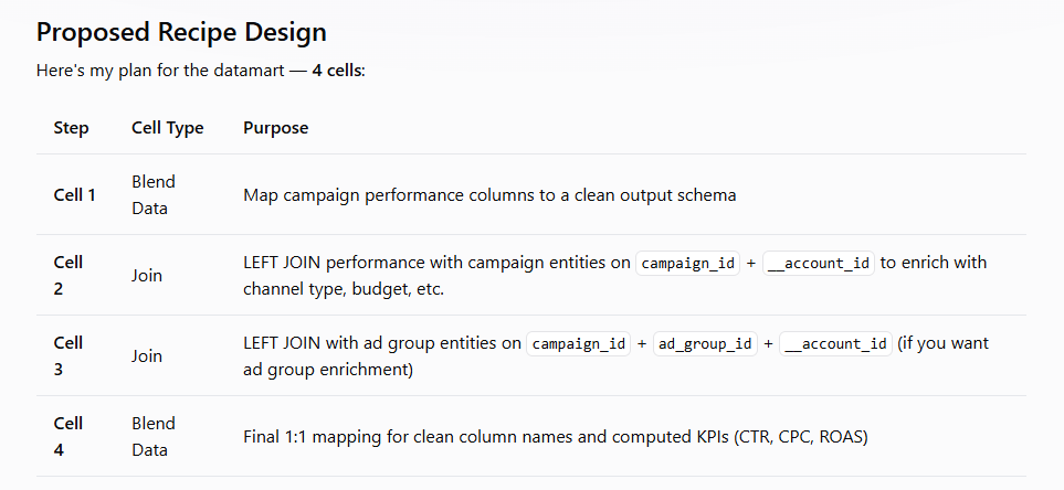 Based on your input, the agent performs an automated exploration of available data sources, inspects table schemas, and generates a proposed recipe design.