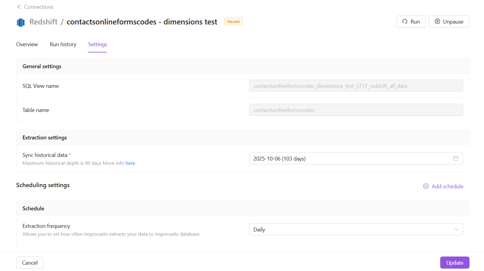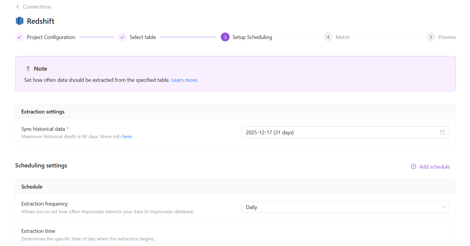 Configure your Extraction scheduling. Allows you to set how often your data is extracted to Improvado storage.