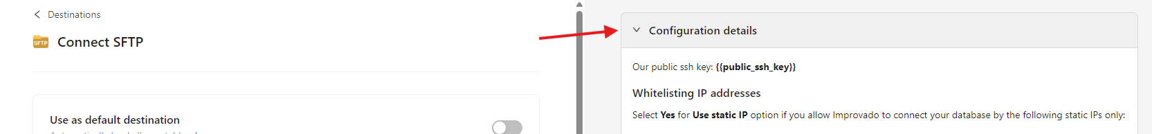 Note: Improvado SSH public key is displayed in UI on the right-hand side of the SFTP connection page in the Configuration details section: