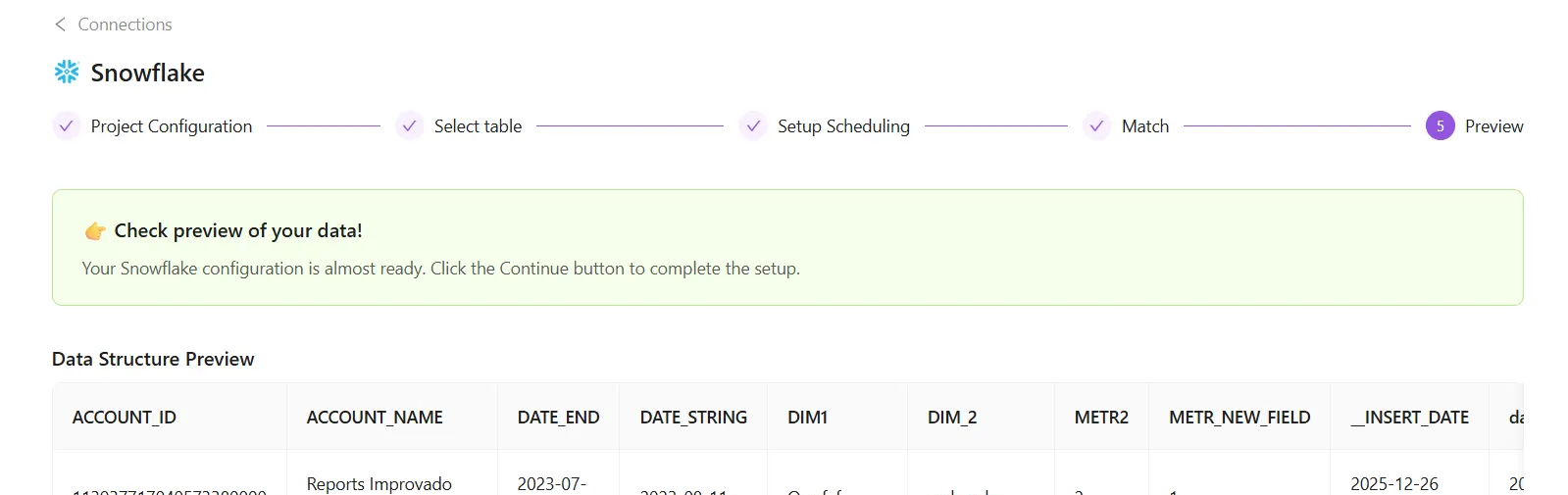 Check the Data Structure Preview. In this step, you see the first row of data that will be extracted after you click the Continue button.