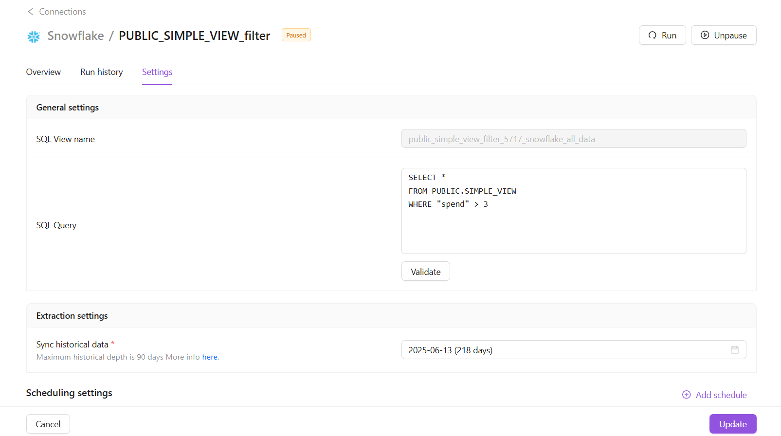 Here you can copy your SQL View name and edit scheduling settings for your data extraction.