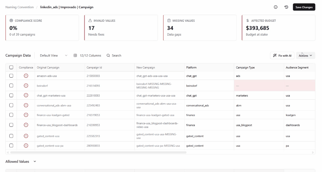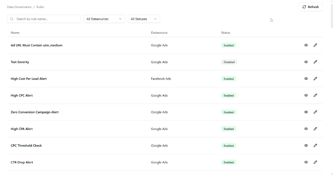 The Refreshed Improvado Data Governance solution introduces a more intelligent, automated approach to monitoring and maintaining marketing data quality. Powered by AI, it strengthens taxonomy compliance, enhances data accuracy, and ensures brand safety — giving teams greater confidence in the integrity of their data and decisions.