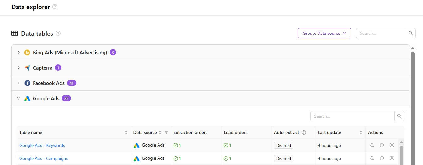 Data tables, connections, and destinations can now be grouped by their source or destination, making large sets of items easier to navigate and manage.